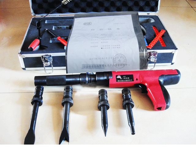 毁锁枪是以爆发力为动力的新型快速破门破锁工具,已获得公安部检测报告。只要装入动力弹,把冲击头对准门锁,可瞬间击毁锁芯,或穿透门板 , 或切断锁舌及切割飞机汽车防盗门等。