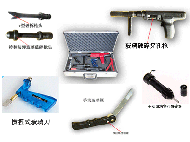 防弹玻璃 破拆穿孔枪 | 无需电源, 可破拆 GA165-1997 《防弹复合玻璃标准》中 F79B 级特种防弹玻璃 | 可破拆 38mm 以下玻璃幕墙;工作速度 0.5m/min ( 破拆玻璃厚度 38mm) 2m/min ( 破拆玻璃厚度 28mm) | 1 把 |