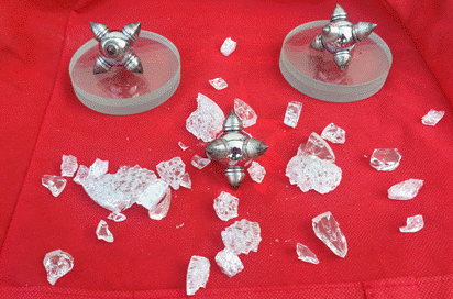 高钻破玻球为六锥圆球体,在球面均等镶嵌六颗硬质合金高钻破玻锥,破玻球 360 °任何角度接触玻璃表面时,都会得到破玻锥的冲击,玻璃受到高硬度 (HRA89) 破玻锥的冲击作用力瞬间破碎。